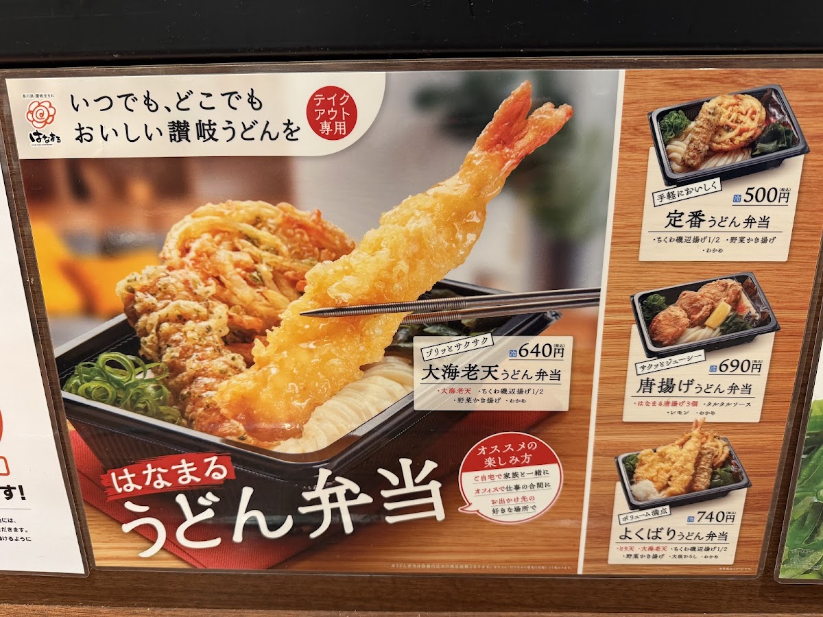 For those who love shrimp, the 大海老天うどん弁当 features large, crispy shrimp tempura, making it a delightful treat. The 塩豚丼 offers a savory pork rice bowl, lightly seasoned with salt to bring out the natural flavors of the meat. If you're in the mood for something crunchy and flavorful, the はなまる唐揚げ is a great choice, offering deliciously crispy fried chicken.