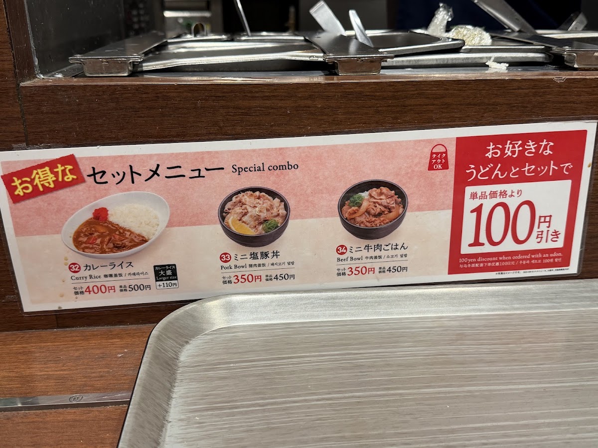 If you enjoy a zesty kick, the おろししょうゆ 大 is a great choice, with its tangy grated daikon and soy sauce that perfectly balance the flavors. For a heartier meal, the きつねうどん is a satisfying option, served with sweet and savory fried tofu, offering a hearty contrast to the chewy udon noodles. The よくばりうどん弁当 is ideal for those who want a little bit of everything, with various toppings served in a convenient bento box.